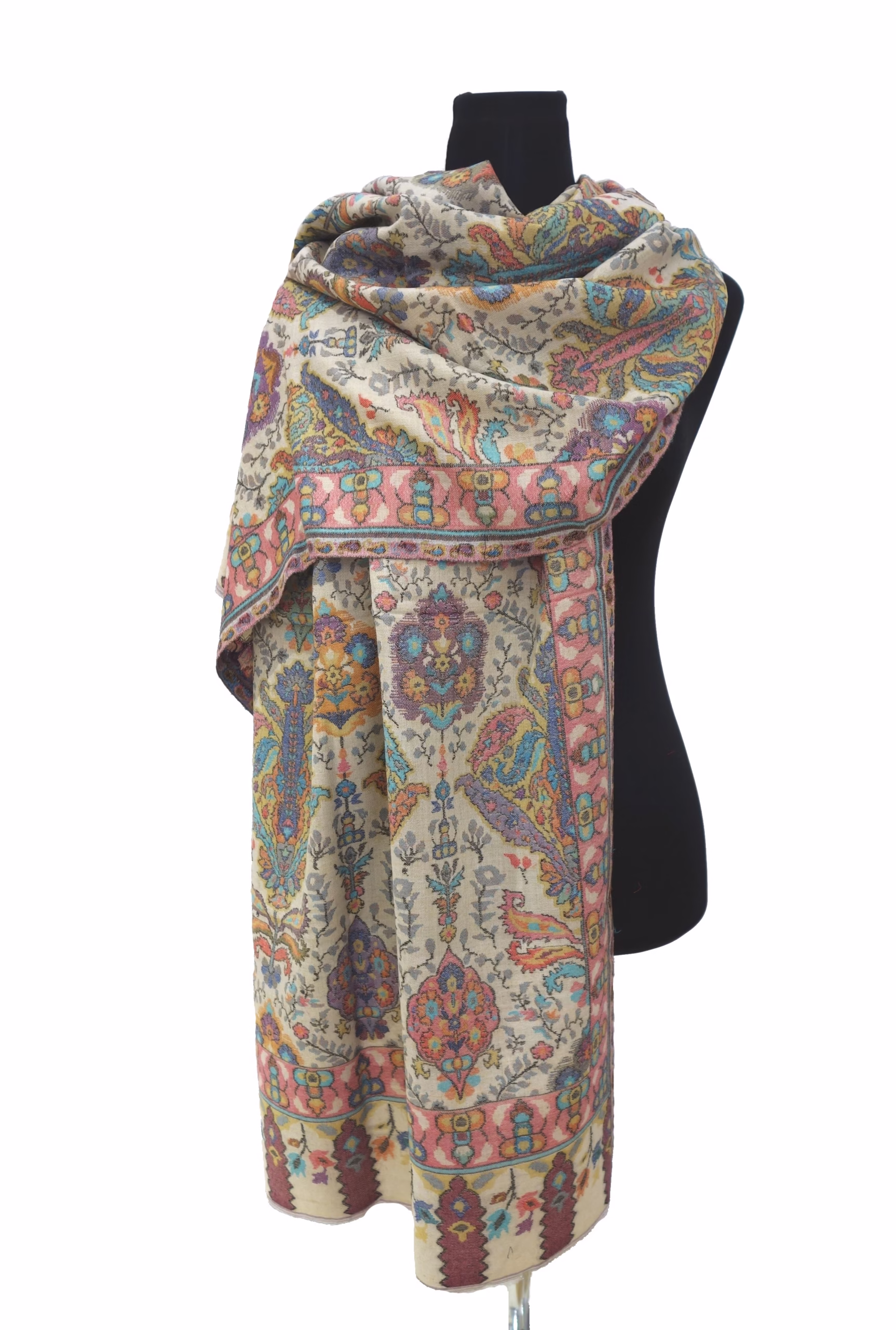 Die Stola/ der Schal ist aus reinem Kaschmir handgewebt in aufwändiger Kanitechnik. Dabei werden je nach Mustervorlage Holzstäbe, die mit Wollfäden in verschiedenen Farben umwickelt sind, durch die Kettfäden gezogen, die auf den Handwebstuhl aufgespannt sind. Je nach Komplexität des Musters dauert der künstlerische Herstellungsprozess Wochen oder mehrere Monaten, in manchen Fällen sogar Jahre.
